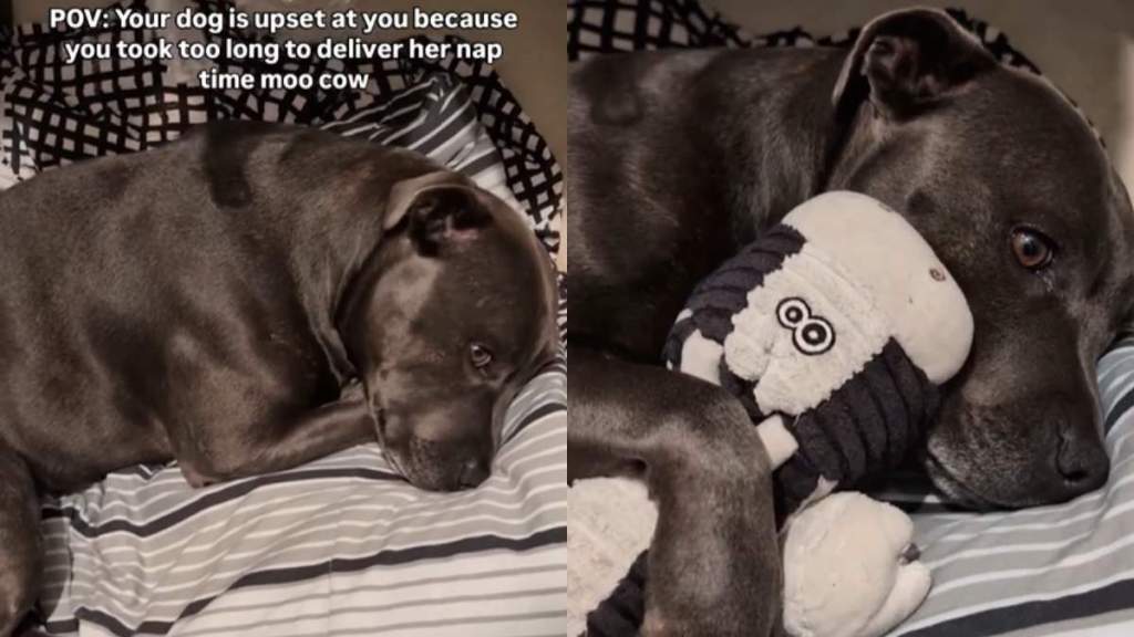 User @hollythebluestaffy shared the clip of the Blue Staffy as she lies on her bed with the lights off, looking sad. The onscreen text explains the reason behind her sorrow. It reads, “POV: Your dog is upset at you because you took too long to deliver her nap time moo cow.”