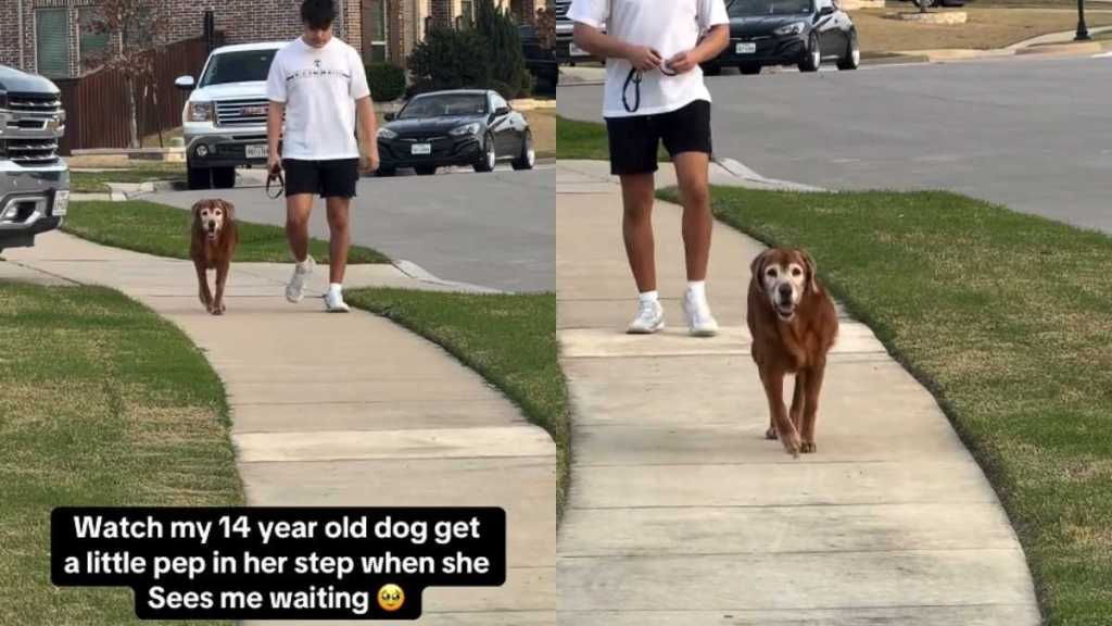 Time shows up differently on dogs. The gray fur, the slower walks, and the quiet naps that seem to last a little longer each year. And that’s why moments like this clip hit people right in the feelings. Shared on @maverick_tha_menace, the video shows Eva, a 14-year-old senior dog, heading back from a walk with her human brother.