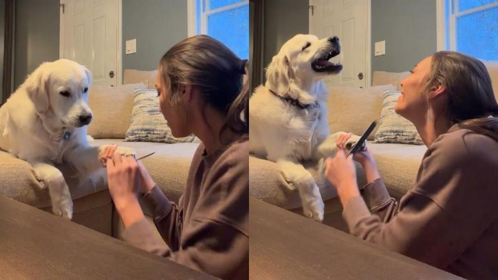 Even then, Vito refuses to stop. When the owner pauses in the video, the Golden Retriever nudges his paw forward again. She goes back to filing his nails again and asks, “You like that?,” while Vito repeats the same delighted, open-mouth reaction that sends her into another round of laughter.