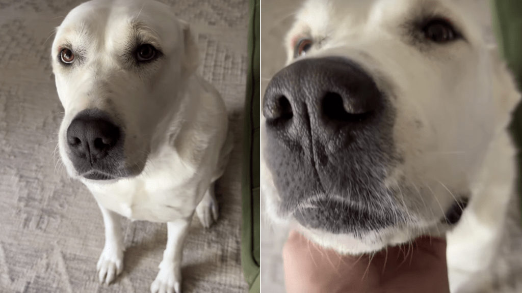 In the video, once the dog receives some love, she asks for more by lifting one paw and reaching it straight toward her owner, to which her human responds by saying, “Oh, you need more attention?” and he obliges. The video then shows Marge’s “big schnoz” taking over the screen as she receives the petting she deserves. This dog wants love and attention, and she wants it now.