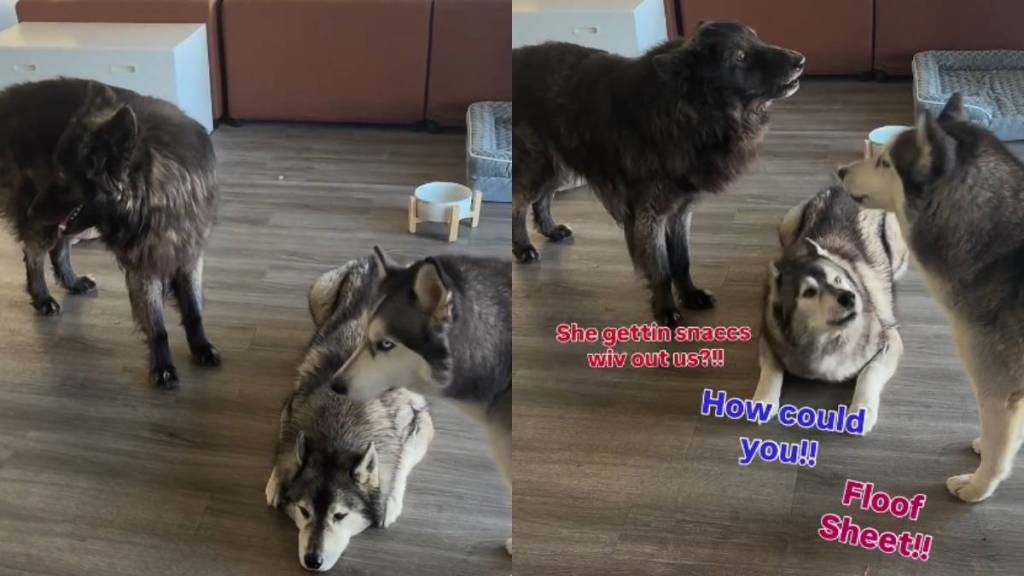 The three dogs are first seen minding their own business until their mom makes an announcement, leaving them flabbergasted. Just when their parent says that the pups “need to stay at home” while she goes out to run some errands, clarifying that they “don’t have to go everywhere with mama,” all three Huskies start howling immediately at various pitches, hinting stern disapproval.